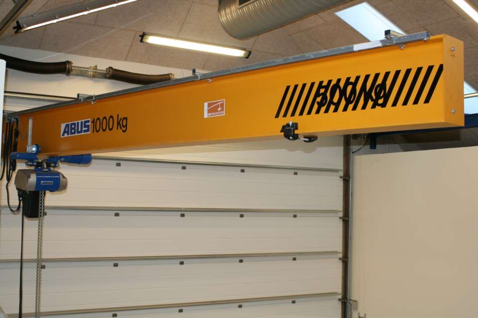 該工廠除了傳統(tǒng)工具外,還使用了幾臺由安博的丹麥代理AB Kransystem ApS(www.abkransystem.dk)設(shè)計、計算、交付和安裝的起重機(jī)和葫蘆。廠內(nèi)的材料運(yùn)輸非常便利,這是因?yàn)榘惭b了幾臺含手動小車的環(huán)鏈葫蘆,和一臺負(fù)載能力為500公斤、跨度為7.1米的DLVM型橋式起重機(jī)(帶軋鋼截面梁和主梁焊接連接的懸掛式起重機(jī))、一臺負(fù)載能力為2噸,臂長為3米的LW型墻式旋臂起重機(jī)以及一臺負(fù)載能力為500公斤、臂長3米的VS型立柱式旋臂起重機(jī)。立柱式旋臂起重機(jī)安裝在廠門旁,這樣旋臂可以轉(zhuǎn)至廠外區(qū)域,起吊負(fù)載后轉(zhuǎn)回廠內(nèi)。該旋臂起重機(jī)的設(shè)計可在以后將其負(fù)載能力提升至1噸。