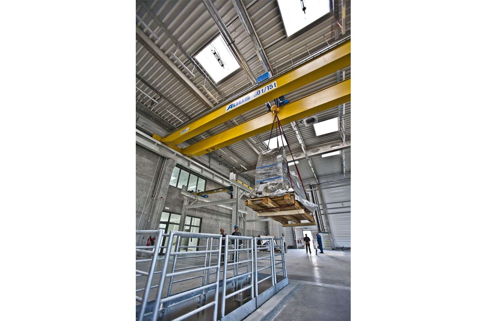 勞斯萊斯海事服務(wù)工廠安裝了兩臺橋式起重機和一臺立柱式旋臂起重機。重型作業(yè)由負載能力為30噸、跨度為18.2米的ZLK型雙梁橋式起重機執(zhí)行,該起重機配有兩臺載重能力為15噸的電動鋼絲繩葫蘆。這些葫蘆由串聯(lián)無線電遙控系統(tǒng)控制,并配有即時顯示當前負載重量的LED顯示器。起重機大車和小車的運行由變頻器控制,允許可調(diào)加速度的靈敏移動。主ZLK起重機還配有一臺安裝在在獨立式鋼結(jié)構(gòu)上、跨度為5米的ELV型單梁橋式起重機。一臺負載能力為2噸的電動環(huán)鏈葫蘆GM6在ELV型起重機上工作。