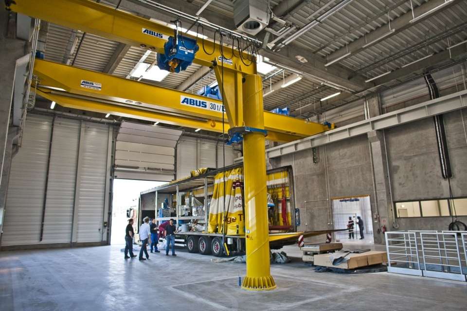 一臺臂長為5米、負載能力為3.2噸的VS立柱式旋臂起重機,與上述兩臺橋式起重機一起構(gòu)成了安博設(shè)備三重奏。該旋臂起重機的額定旋轉(zhuǎn)范圍為n x 360°(雙向無限旋轉(zhuǎn))。