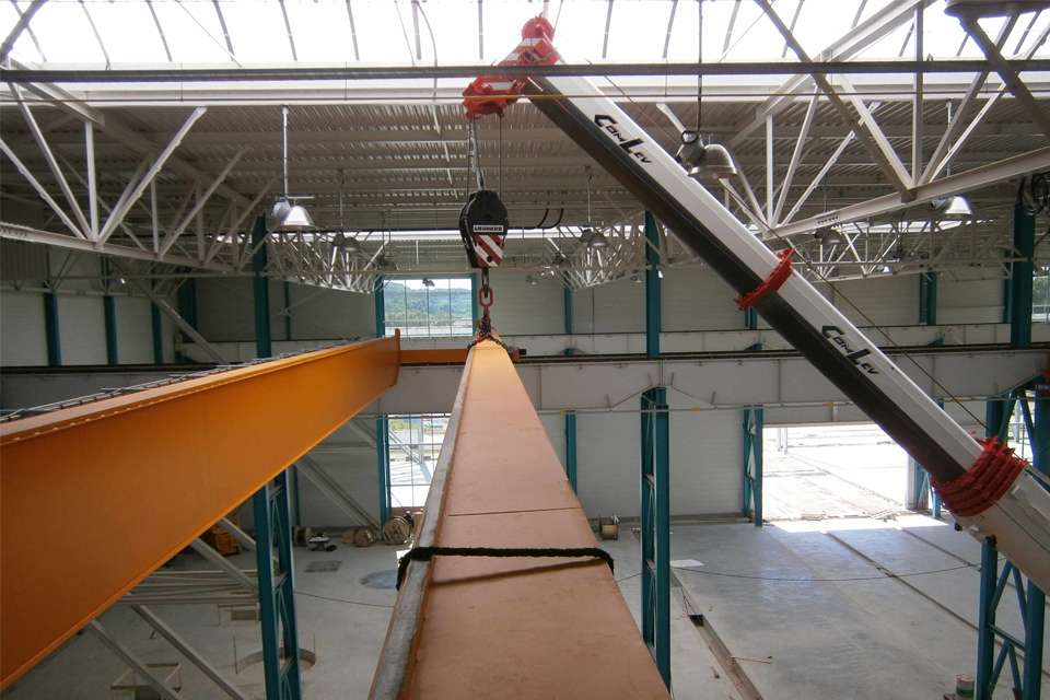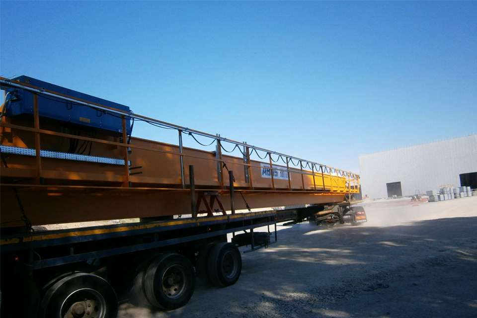 Compiegne的四個(gè)車間安裝了10臺(tái)跨度為23米、載重能力在10到80噸之間的橋式起重機(jī),用于運(yùn)輸混凝土構(gòu)件。安博起重位于南錫的法國(guó)子公司ABUS Levage France (www.abus-levage.fr)負(fù)責(zé)技術(shù)支持、銷售、安裝和調(diào)試。1號(hào)和2號(hào)車間用作倉(cāng)庫(kù),安裝了兩臺(tái)起重量為10噸的ELK單梁橋式起重機(jī)和一臺(tái)起重量為32噸的ZLK雙梁橋式起重機(jī)。這臺(tái)雙梁橋式起重機(jī)的特點(diǎn)是配有一個(gè)下沉式設(shè)計(jì)的ZA雙梁電動(dòng)葫蘆,確保了可用凈空高度的優(yōu)化利用。3號(hào)和4號(hào)車間是生產(chǎn)區(qū)域,各種混凝土材料在這里被放在一起,組成了待建造塔的各個(gè)部分。僅有雙梁橋式起重機(jī)運(yùn)行于這片區(qū)域,它們與下沉式設(shè)計(jì)的小車配合實(shí)現(xiàn)了凈空高度的最佳利用。在另一個(gè)存儲(chǔ)區(qū)域,另有一臺(tái)負(fù)載能力為80噸的雙梁橋式起重機(jī)正在運(yùn)行。由于這臺(tái)起重機(jī)也會(huì)用于室外,它被涂上了一種特殊的油漆以抵御各種天氣,其電動(dòng)葫蘆、驅(qū)動(dòng)電機(jī)以及面板都覆蓋著保護(hù)罩。所有的起重機(jī)均由安博無(wú)線遙控器操作。