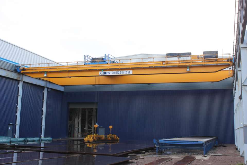 安博提供的一臺(tái)室外起重機(jī),用于在生產(chǎn)開(kāi)始時(shí)將金屬板材裝載至輸送機(jī)上進(jìn)行拋丸處理,該起重機(jī)裝有防雨罩、風(fēng)暴錨和風(fēng)力測(cè)量系統(tǒng),以免在不利的強(qiáng)風(fēng)中使用起重機(jī)造成電機(jī)的損壞。指示燈會(huì)提醒起重機(jī)操作員龍門(mén)架上的風(fēng)力強(qiáng)度。該起重機(jī)的全長(zhǎng)平臺(tái)由金屬網(wǎng)制成而非板材,以確保雨雪不會(huì)堆積于此。起重機(jī)還配有三個(gè)鹵素照明燈,以便在能見(jiàn)度低的情況下,起重機(jī)也可安全使用。經(jīng)過(guò)特別設(shè)計(jì)的小車(chē)架垂直安裝于起重機(jī)梁上,可容納兩個(gè)電動(dòng)葫蘆,能夠?yàn)榇帕Φ趿禾峁┨嵘c(diǎn),處理長(zhǎng)達(dá)16米的鋼板。