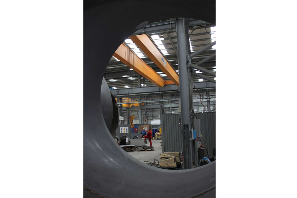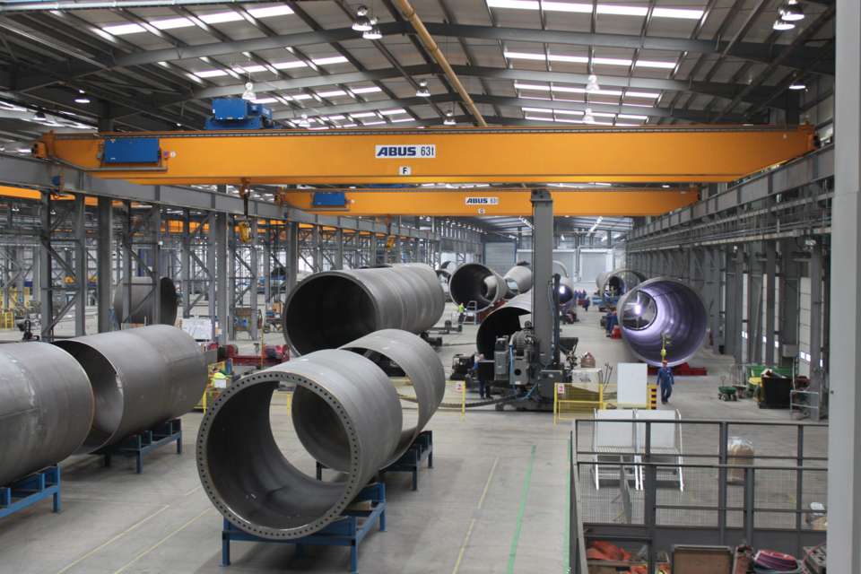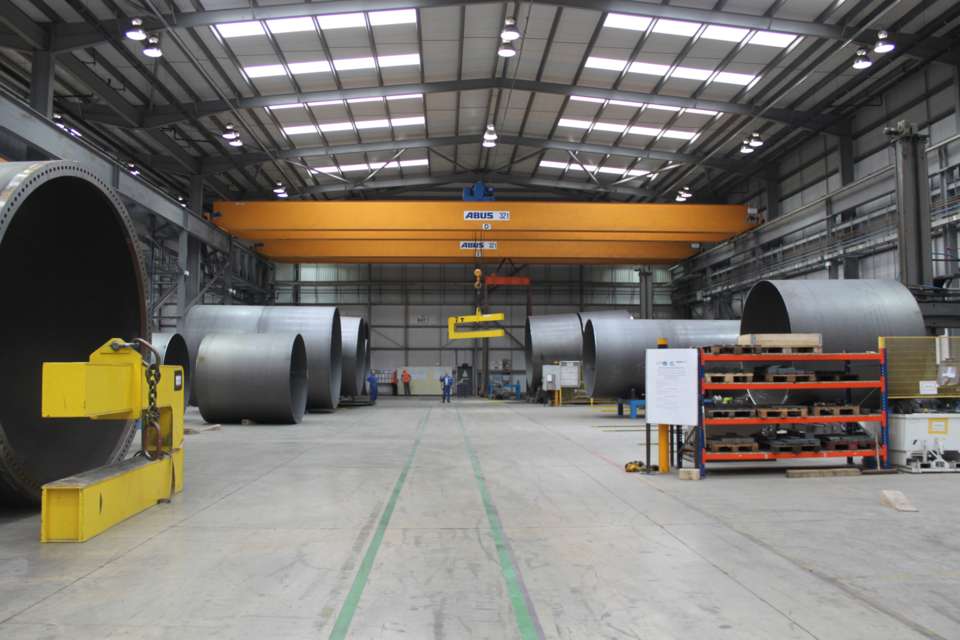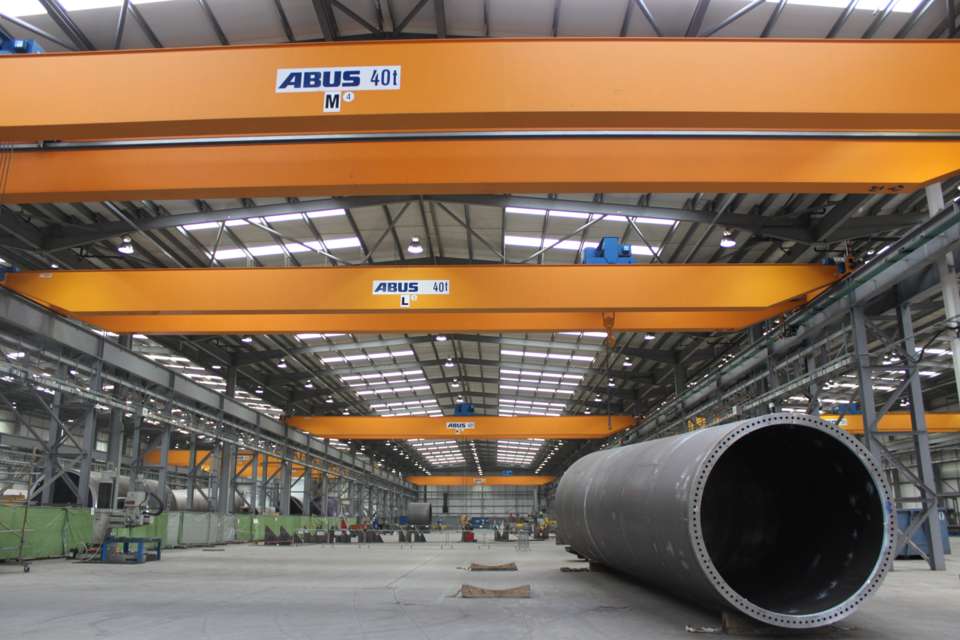 Mabey Bridge公司風(fēng)力渦輪機(jī)塔和管狀產(chǎn)品的生產(chǎn),由安全起重量為20噸、32噸、40噸和63噸的安博ZLK型雙梁橋式起重機(jī)完成,一些起重機(jī)已安裝了全長(zhǎng)檢查平臺(tái),用于提供高水準(zhǔn)維護(hù)服務(wù);還有一些起重機(jī)配備了為起重機(jī)吊鉤提供電源插座的電纜卷筒,用于磁力吊梁。起重量為63噸的起重機(jī)配有同步無(wú)線(xiàn)遙控器裝置,具有安全反饋功能,可使一臺(tái)起重機(jī)完美鏡像出另一臺(tái)起重機(jī)的操作。如果一臺(tái)起重機(jī)激活了安全限位開(kāi)關(guān)并因此減速,則另一臺(tái)起重機(jī)也會(huì)如此,這樣,在起重機(jī)同步操作下,任何負(fù)載都可確保安全。