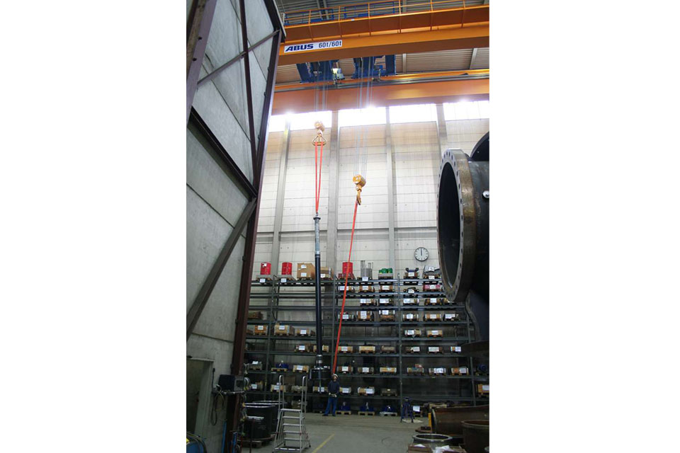 這些泵在大小、重量和尺寸上有著顯著差異,適用于輸送任何流體。該司總部生產(chǎn)的泵系列產(chǎn)品的特點(diǎn)之一是低壓下的高流量。這種泵用于海水淡化廠和飲用水處理廠,每小時(shí)可泵送10萬立方米流體。泵體高度可達(dá)20米。單個(gè)部件在被水平運(yùn)至裝配車間,再被垂直組裝成泵。安博提供了一臺ZLK型雙梁橋式起重機(jī),該起重機(jī)配有兩個(gè)起重量為60噸的電動鋼絲繩葫蘆,用以協(xié)助完成這項(xiàng)艱巨的搬運(yùn)任務(wù)。該起重機(jī)不僅能提升和降低負(fù)載,還可以翻轉(zhuǎn)負(fù)載。兩個(gè)提升裝置均由帶雙軌小車的雙卷筒葫蘆組成。組裝泵時(shí),電動葫蘆可提升單個(gè)重量在2.5至45噸之間的部件。組裝過程的每一步都需要精準(zhǔn)升降來適應(yīng)泵的各個(gè)部件,同樣也需要快速運(yùn)輸部分負(fù)載,以節(jié)省大量時(shí)間。KSB公司指定的四種不同運(yùn)行速度通過ABUliner變頻器得以實(shí)現(xiàn):在微速提升中,可實(shí)現(xiàn)每分鐘0.2至1米的無級變速;在高速提升中,根據(jù)負(fù)載情況可達(dá)到每分鐘12.6米的最高速度。泵在組裝完畢后,會被運(yùn)至位于裝配車間內(nèi)的試驗(yàn)臺。