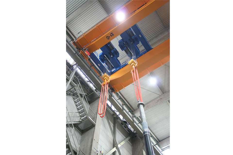 翻轉(zhuǎn)懸吊的負(fù)載是一項(xiàng)特別需要小心謹(jǐn)慎的任務(wù)。該起重機(jī)的兩個(gè)提升裝置可以相互獨(dú)立操作以翻轉(zhuǎn)負(fù)載。KSB公司使用帶有三個(gè)主開關(guān)的安博無線遙控器ABURemote來控制提升裝置。左操縱桿控制起重機(jī)移動,每個(gè)提升裝置都有自己的操縱桿用于控制移動、提升和下降。因此,起重機(jī)操作者能夠以不同的速度和方向控制葫蘆翻動負(fù)載。隨后,操作者可以讓小車彼此靠近,直到泵的長部件最終完全由一個(gè)吊鉤懸掛。安裝于起重機(jī)上的一個(gè)可實(shí)時(shí)顯示懸浮載荷的大型負(fù)載顯示屏和為工作區(qū)域提供良好照明的四個(gè)鹵素照明燈,為操作提供了額外的安全保障。