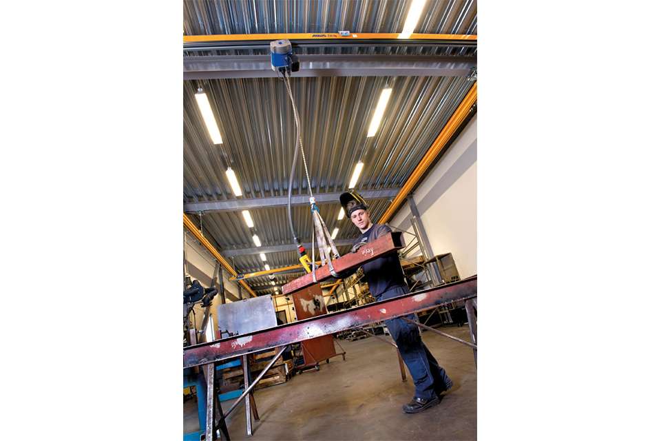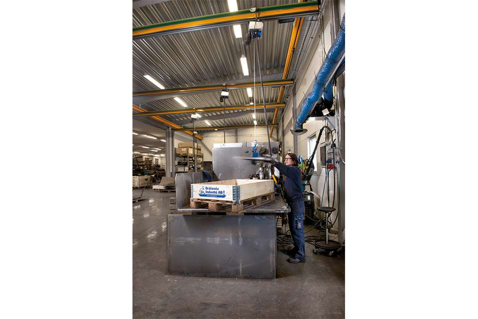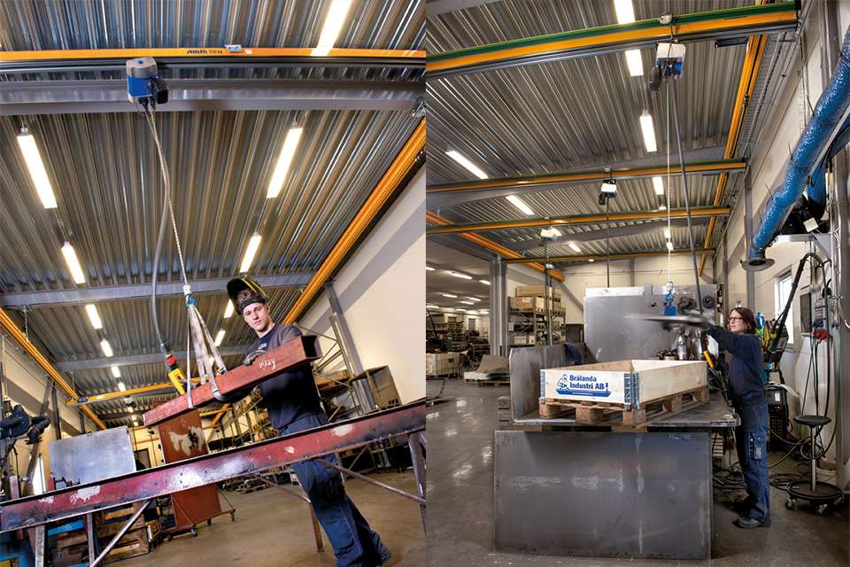 自1996年以來的生產(chǎn)處理流程中,該司一直使用安博起重機(jī)用于不同區(qū)域的部件運輸。Br?landa Industri AB公司購買的第一臺起重機(jī)是起重量為3.2噸的單梁橋式起重機(jī)。幾年里,他們又增加了幾臺旋臂起重機(jī),為各個工作站提供服務(wù)。隨著公司的不斷發(fā)展、產(chǎn)品幾近訂購一空。2015年春季,該司進(jìn)行了進(jìn)一步投資,又購買了一套安博HB輕型懸掛系統(tǒng)以優(yōu)化內(nèi)部物流。這套HB系統(tǒng)是由一個配有三臺跨度6.6米的起重機(jī)的EHB輕型單梁懸掛系統(tǒng)組成,這三臺起重機(jī)運行于同一個長39米的軌道上。其中兩臺起重機(jī)的最大負(fù)載能力為250公斤,第三臺起重機(jī)的安全起重量為500公斤。三臺起重機(jī)均配置了帶手動小車行走的安博電動環(huán)鏈葫蘆。起重機(jī)軌道由久經(jīng)考驗的安博HB250型材組成。在起重機(jī)型材上,對于250公斤較低起重量的起重機(jī)采用了新型HB150S型材,而對于500公斤較高起重量的起重機(jī)則采用了HB190S型材。新HB系統(tǒng)的引入,安博重新詮釋了成熟的技術(shù):先進(jìn)的型材與優(yōu)化的行走小車相匹配,這一組合提高了起重機(jī)的移動精度,并有助于保障日常起重機(jī)操作的平穩(wěn)性和安靜性。這意味著起重機(jī)操作人員在移動負(fù)載時享有更高的舒適度,因為他們可以簡單、便捷地手動操作起重機(jī)在此類負(fù)載范圍內(nèi)的移動。機(jī)械式測距裝置可確保三臺起重機(jī)保持所需的間距。