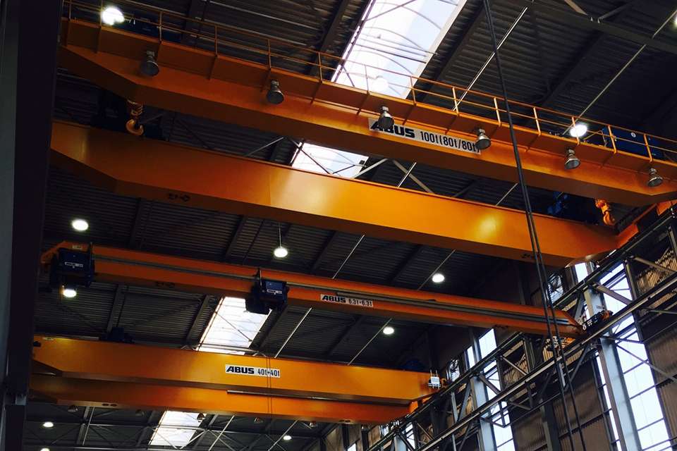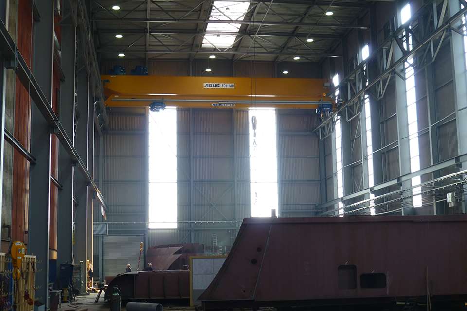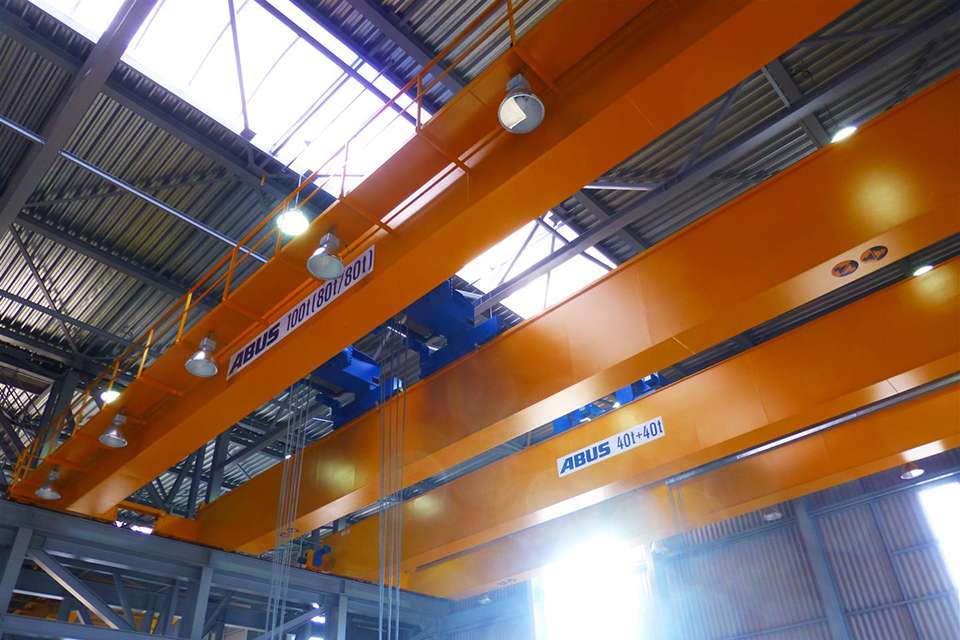 安博公司的荷蘭子公司Kraansystemen BV (www.abus-kraansystemen.nl)為Hoogezand的新生產(chǎn)車間提供了以下起重機(jī):三臺(tái)跨度為21.6米的ELK型單梁橋式起重機(jī),每臺(tái)起重機(jī)配備兩臺(tái)負(fù)載能力為6.3噸的電動(dòng)鋼絲繩葫蘆;兩臺(tái)跨度為22.3米的大型ZLK型雙梁橋式起重機(jī),其中一臺(tái)ZLK起重機(jī)負(fù)載能力為100噸,由兩臺(tái)額定載荷為80噸的電動(dòng)鋼絲繩葫蘆組成;第二臺(tái)雙梁橋式起重機(jī)配備的是兩臺(tái)額定載荷為40噸的電動(dòng)鋼絲繩葫蘆。兩臺(tái)起重機(jī)協(xié)同工作時(shí)總起重能力可達(dá)180噸。因此,車間在生產(chǎn)過程中可安全運(yùn)輸長(zhǎng)而大的部件。起重機(jī)通過安博搖桿式無線電控制系統(tǒng)操作。起重機(jī)的控制單元具有獨(dú)立的控制元件,可單獨(dú)操控每臺(tái)起重機(jī)。選擇開關(guān)可以操控單臺(tái)電動(dòng)葫蘆,也可以同時(shí)操控兩臺(tái)電動(dòng)葫蘆,甚至還可以在相反方向操控起重機(jī),即起重機(jī)被釋放用于翻轉(zhuǎn)負(fù)載。沿起重機(jī)橋安裝的起重機(jī)燈可照亮工作區(qū)域,為起重機(jī)用戶提供額外的安全性。起重機(jī)用戶均需接受培訓(xùn),以滿足這項(xiàng)嚴(yán)苛運(yùn)輸任務(wù)的特殊要求。