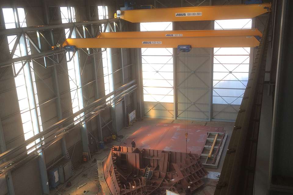 船舶下水前需要無數(shù)的工作步驟。在Royal Bodewes造船廠,這些船由獨(dú)立的部件組成:船橋、船頭、船尾和中間部分。三臺(tái)ELK起重機(jī)用于這些部件的焊接和安裝過程。有趣的是,船頭和船尾都是倒立著工作的(部件,而非人)。船頭和船尾的工作完成后,使用雙梁橋式起重機(jī)轉(zhuǎn)動(dòng)這些部件。船的中間部分被分為三個(gè)部分:船體和兩個(gè)艙壁,此處的焊接和裝配過程也使用了單梁橋式起重機(jī),將船體和艙壁組裝成中間部分。這樣一個(gè)中間部分的實(shí)重約為150噸。吊裝過程需要使用兩臺(tái)雙梁起重機(jī)進(jìn)行協(xié)同操作。