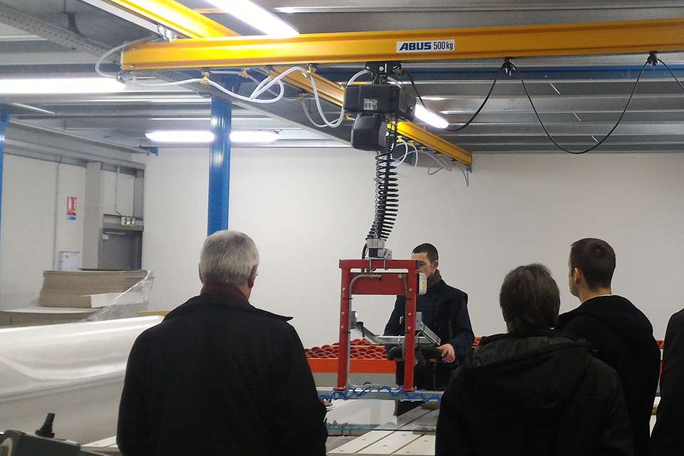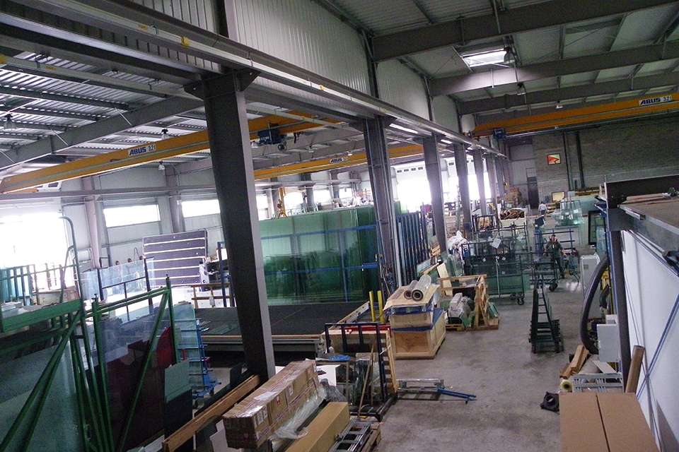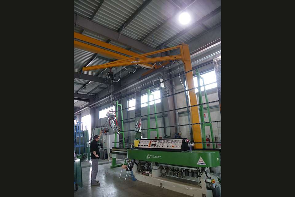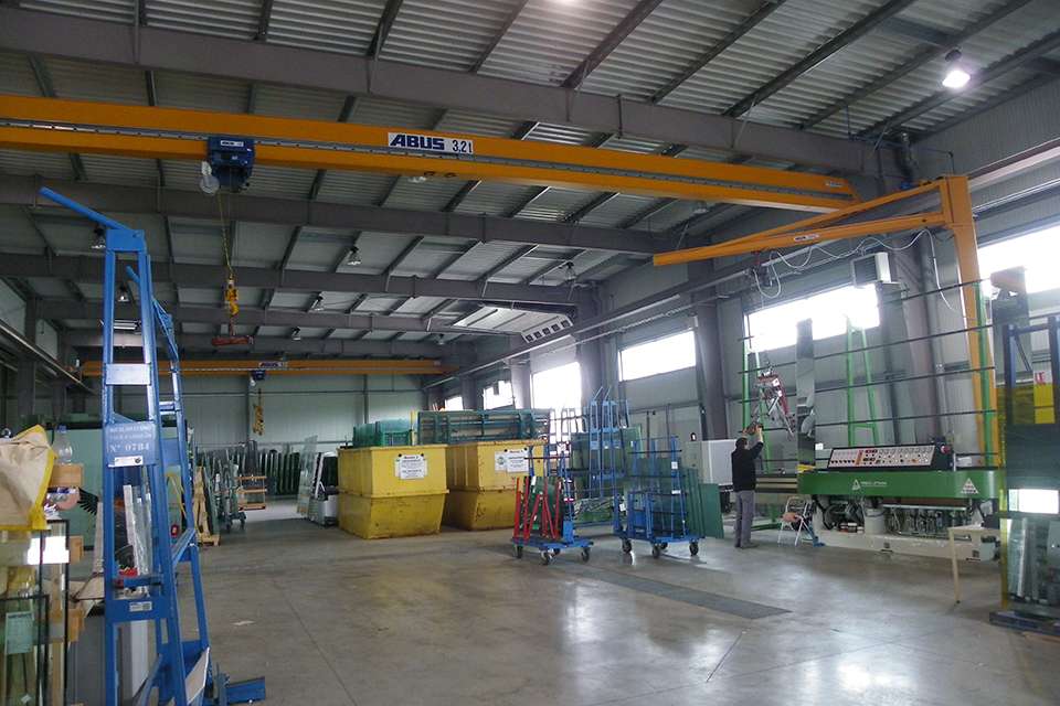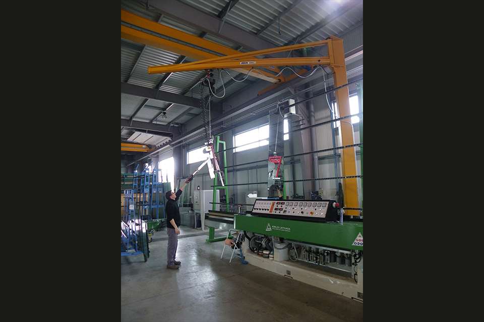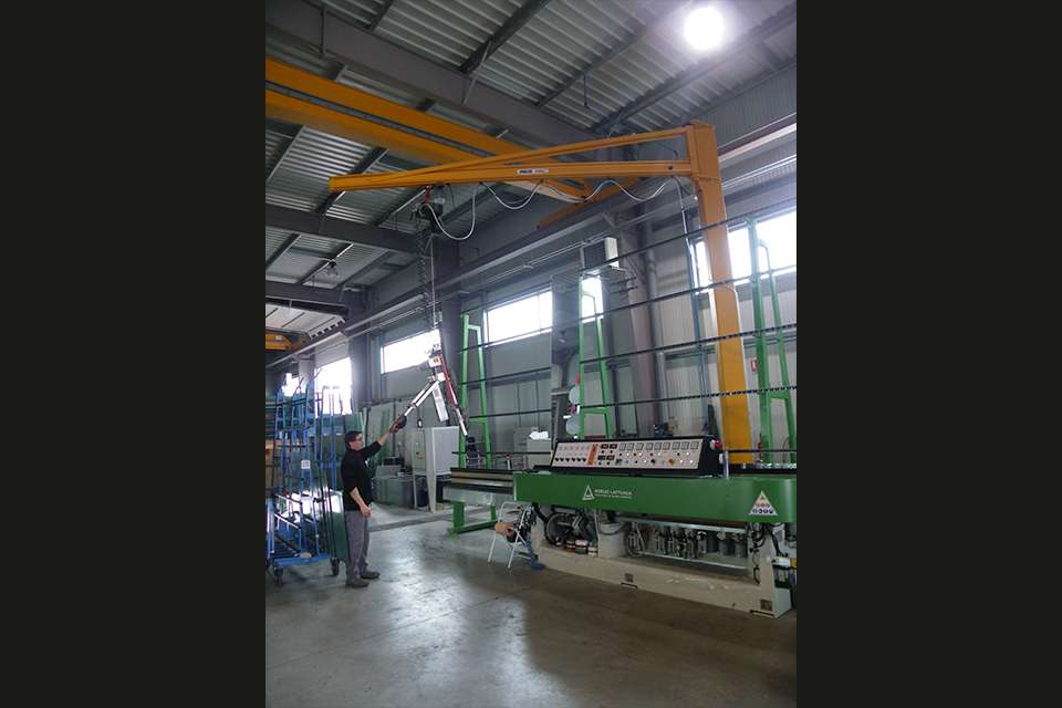 Miroiterie Righetti采用不同型號的安博起重機來吊運玻璃制品和玻璃板。他們使用了三臺起重量為3.2噸、跨度為19.6米的ELK型單梁橋式起重機,單梁起重機是中小負(fù)載范圍內(nèi)最常用的起重機之一。有利的尺寸可同時保證最高的吊鉤位置和最小的小車凈空尺寸。在工廠二層,Miroiterie Righetti公司使用了一臺LS型立柱式旋臂起重機和一套EHB-X型HB輕型懸掛系統(tǒng)用于物流。立柱式旋臂起重機的安全起重量為400公斤,臂長5米。當(dāng)負(fù)載需要通過平穩(wěn)運行的懸臂實現(xiàn)有效且精確地移動時,270度的回轉(zhuǎn)半徑使立柱式旋臂起重機成為較低負(fù)載范圍內(nèi)理想的工位起重機。起重量為1噸的HB輕型懸掛系統(tǒng)也被設(shè)計用于起吊低范圍負(fù)載。負(fù)載在生產(chǎn)車間內(nèi)沿15米長的軌道移動。EHB-X型起重機的特點是安裝高度極低。起重機本身是直立式的,即并非在起重機軌道下方運行,而是運行于軌道之間,從而最大限度地利用工廠的現(xiàn)有高度。