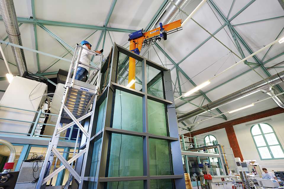 從9米多的高處俯瞰,可以看到一個(gè)5米深的水池。然而,沒有一個(gè)技術(shù)嫻熟的跳水運(yùn)動(dòng)員會(huì)期待在這里騰空、轉(zhuǎn)體、優(yōu)雅入水。在Osnabrück大學(xué)(位于聯(lián)邦德國西北部下薩克森州的一座城市)的工藝技術(shù)實(shí)驗(yàn)室里,這個(gè)裝有12000升液體、重17噸的大水池,插有膜組件用于研究。實(shí)驗(yàn)室主任弗蘭克·赫爾莫斯教授表示,水池的玻璃墻厚4厘米,能夠承受住卡車的撞擊。