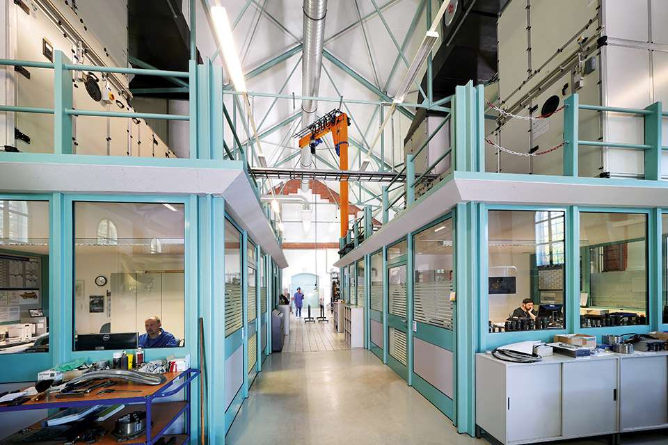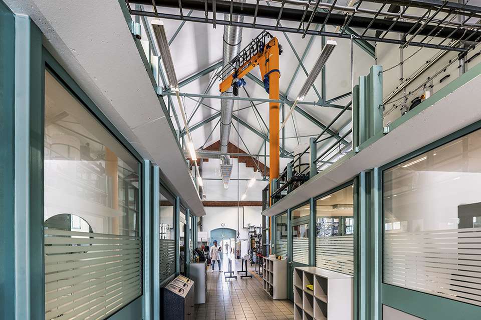 這些研究需要將模塊非常精確且小心地提升到池中。VS型安博旋臂起重機(jī)用于完成這項(xiàng)高9.83米的任務(wù)。相比之下,起重機(jī)臂長只有2.76米。旋臂起重機(jī)配備了起重能力為1000公斤的GM4型電動(dòng)環(huán)鏈葫蘆。安博立柱式旋臂起重機(jī)的最大安全工作載荷可達(dá)6.3噸,根據(jù)額定載荷的不同,旋臂長度可達(dá)10米。負(fù)載能力在4噸以下的旋臂起重機(jī)會(huì)安裝安博電動(dòng)環(huán)鏈葫蘆,而負(fù)載能力較大的起重機(jī)則會(huì)將安裝安博電動(dòng)鋼絲繩葫蘆。所有VS型旋臂起重機(jī)的工作半徑均為360度。如有需要,可通過機(jī)械回轉(zhuǎn)限位裝置來限制操作半徑。這些回轉(zhuǎn)限位裝置可以以15度的間隔擰緊并重新定位。因此,回轉(zhuǎn)范圍可以在0到255度之間調(diào)節(jié)。當(dāng)前應(yīng)用安裝了兩個(gè)回轉(zhuǎn)限位裝置。
