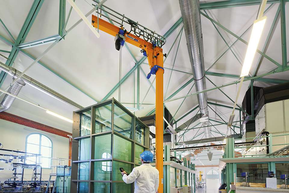 這臺(tái)起重機(jī)的特殊之處不僅在于其近10米的高度:該起重機(jī)的所有電驅(qū)動(dòng)動(dòng)作,如起吊、電動(dòng)葫蘆移動(dòng)和旋臂回轉(zhuǎn)均配有ABUliner變頻器。由于變頻器的控制,加速度是無級(jí)可變的,可以以任何選定速度運(yùn)行。因此,ABUliner保證了負(fù)載的起升、回轉(zhuǎn)和移動(dòng)特別靈敏,并能將負(fù)載精準(zhǔn)定位于所需位置。起重機(jī)通過起重機(jī)的控制單元手動(dòng)操作,本案例中該控制單元是一個(gè)無線電遙控器。