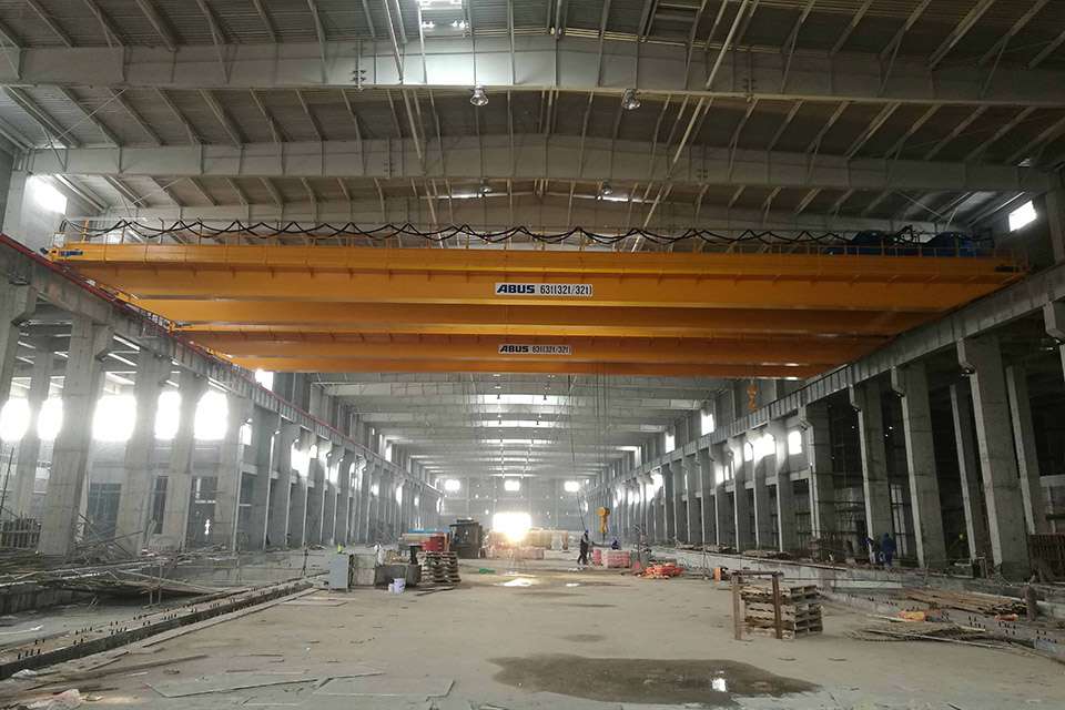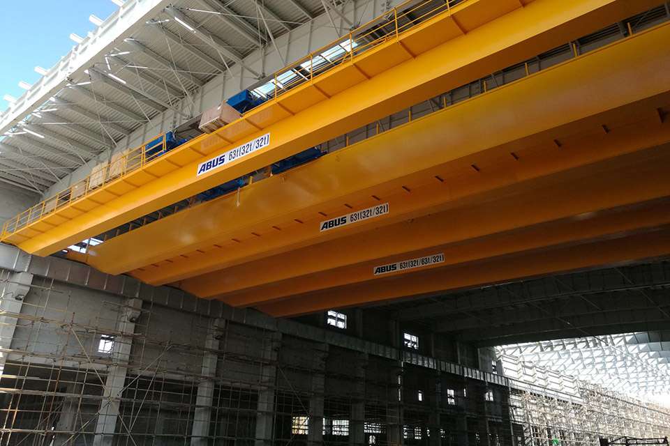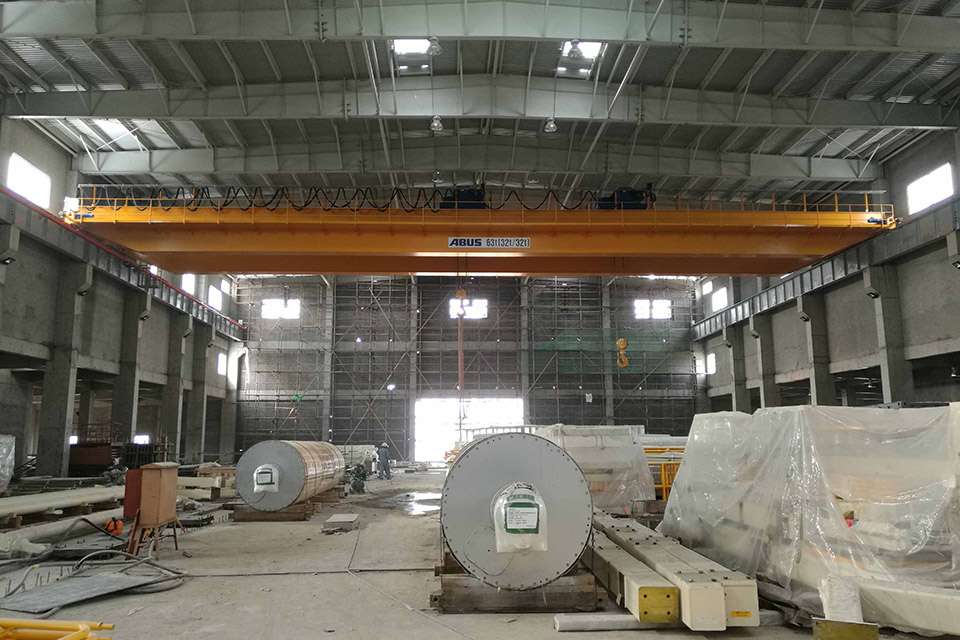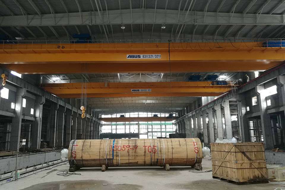 新的生產(chǎn)基地共安裝了三臺(tái)橋式起重機(jī)。巨大的紙卷由三臺(tái)跨度37.2米、起升高度22.5米的ZLK雙梁橋式起重機(jī)起吊。其中兩臺(tái)橋式起重機(jī)配有兩臺(tái)負(fù)載能力為32噸的GM7000系列電動(dòng)鋼絲繩葫蘆。第三臺(tái)橋式起重機(jī)安裝了三個(gè)電動(dòng)葫蘆:除了兩個(gè)負(fù)載能力為32噸的鋼絲繩葫蘆外,還有負(fù)載能力為63噸的第三個(gè)電動(dòng)葫蘆。