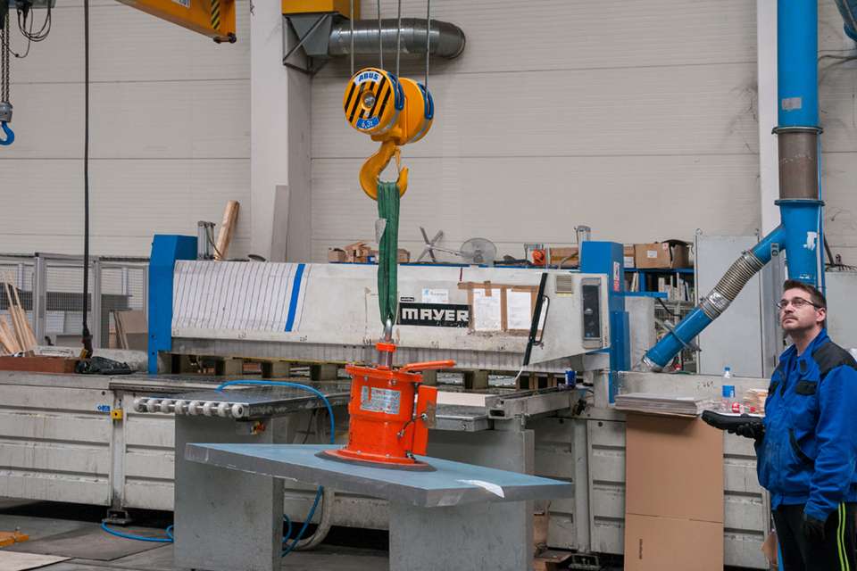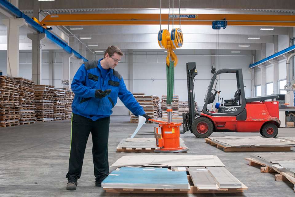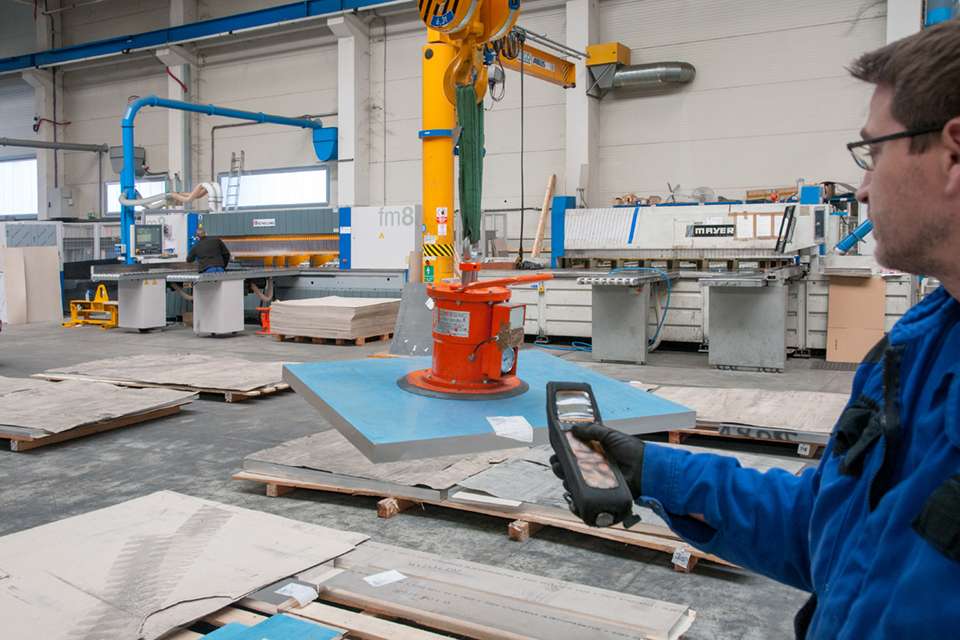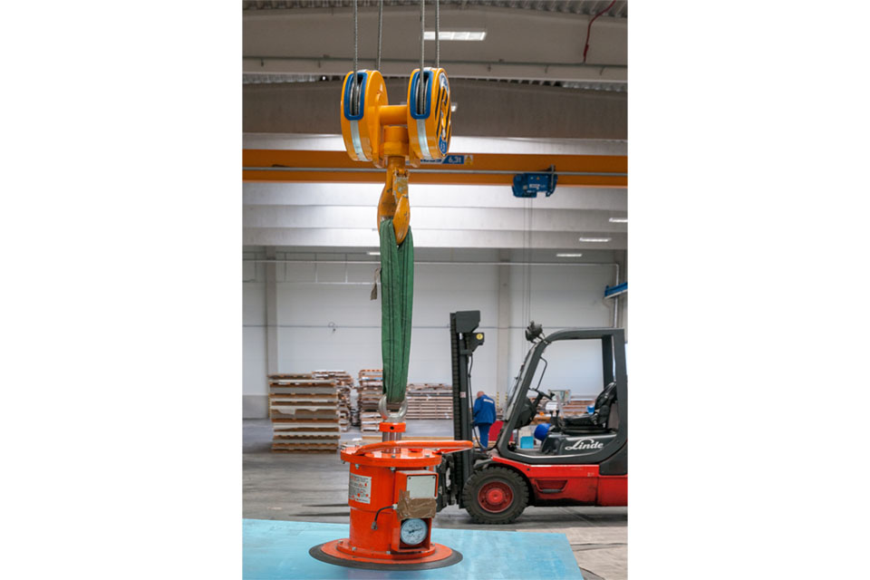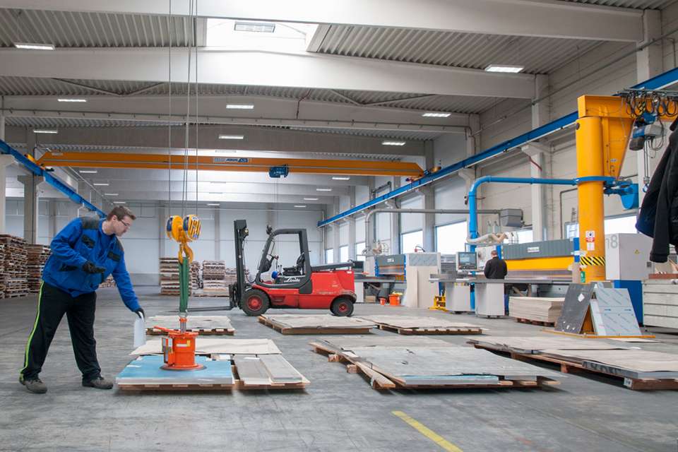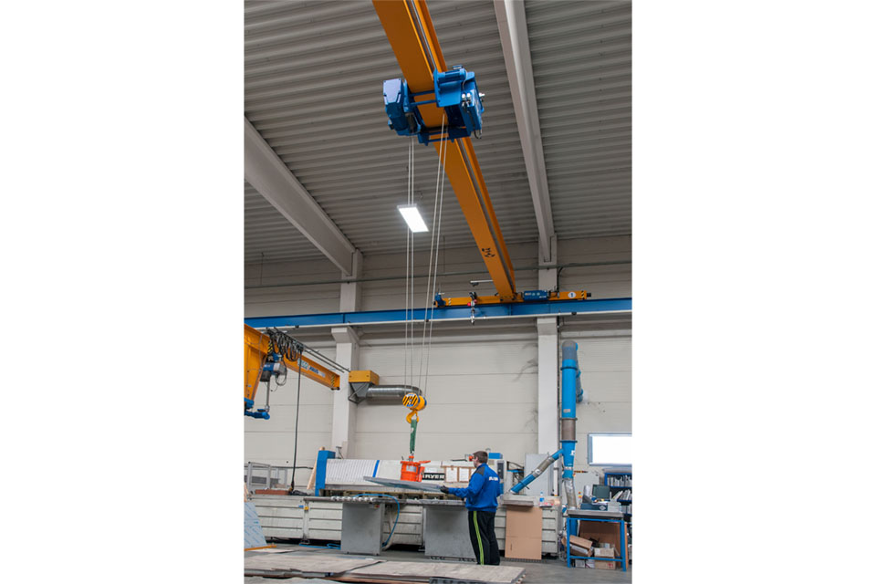 不同尺寸的鋁板從貨架運至各自的加工機械,在有安博起重機運行的生產(chǎn)工廠內(nèi)根據(jù)客戶的要求進行切割。由于具有LIS-SV過載保護系統(tǒng),起重機用戶在提升這些巨大的鋁板時,能夠在無線遙控器的顯示器上讀出所起吊的貨物重量。工廠安裝了兩臺載重量達6.3噸、跨度23米的ELK型單梁橋式起重機,用以提升鋁板。如果需要起吊尺寸較小、重量較輕的板材,VS立柱式旋臂起重機則將發(fā)揮作用:這種立柱式旋臂起重機臂長4米,可起吊重達1.6 噸的負載。真空裝置用于將板材置于起重機上。該真空裝置分別懸掛在橋式起重機和旋臂起重機的吊鉤上。