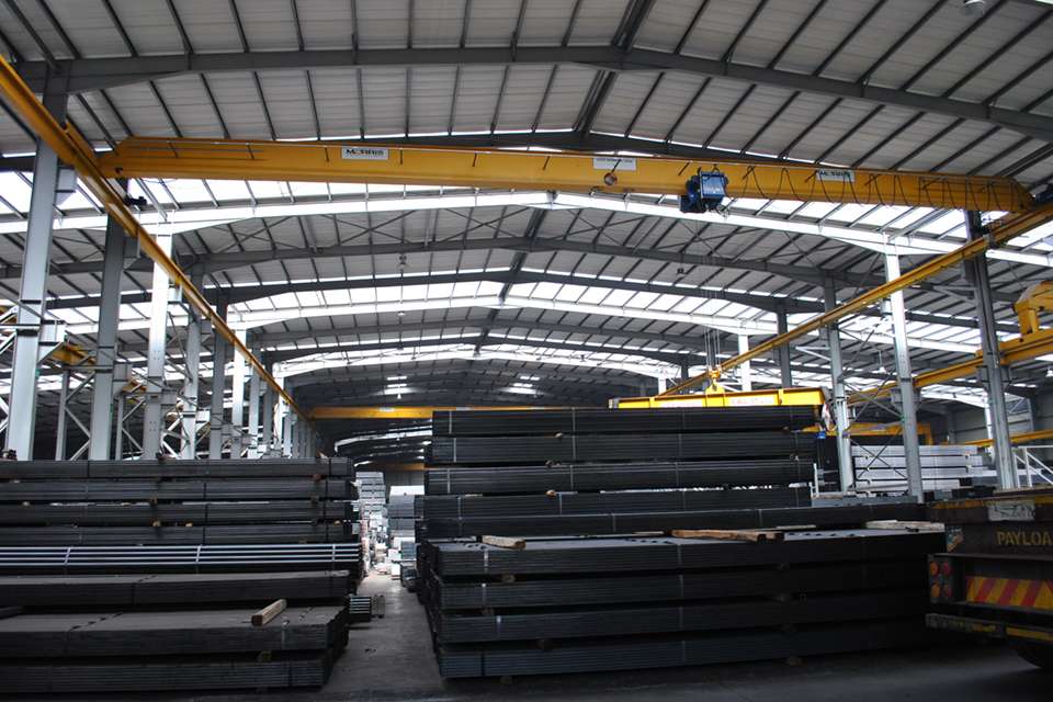 11臺具有不同起重量和跨度的橋式起重機(jī),主要用于生產(chǎn)和存儲的三個(gè)區(qū)域。6臺額定載荷為5噸、跨度為24至25米的ELK型單梁橋式起重機(jī),用于處理直徑相對較小的圓管和方管。大直徑的圓管和方管以及唇形槽或C型軌道,可通過ELK型起重機(jī)搬運(yùn);ELK型起重機(jī)具有達(dá)10噸的更大起重能力,跨度為23米至25米。所有這些起重機(jī)的一個(gè)共同特點(diǎn)是它們具有抗扭轉(zhuǎn)的焊接箱型梁。起重量為10噸的單梁設(shè)計(jì)起重機(jī),跨度可達(dá)27.5米。