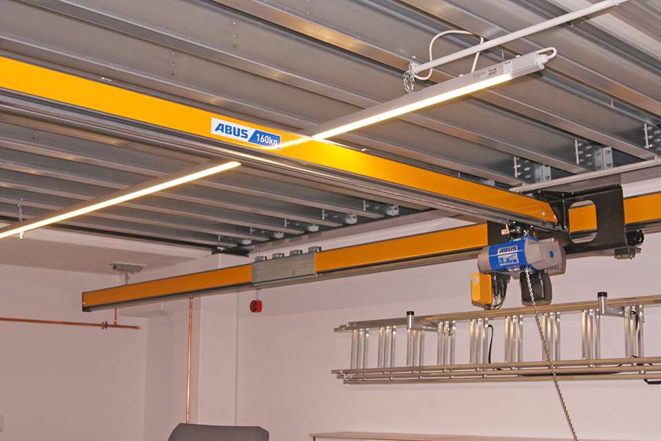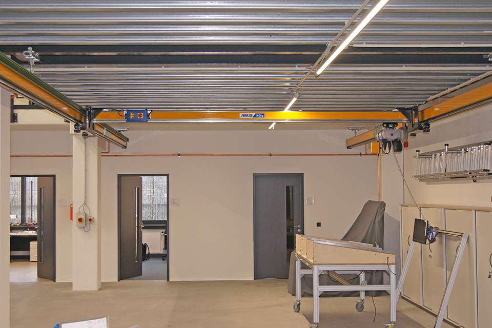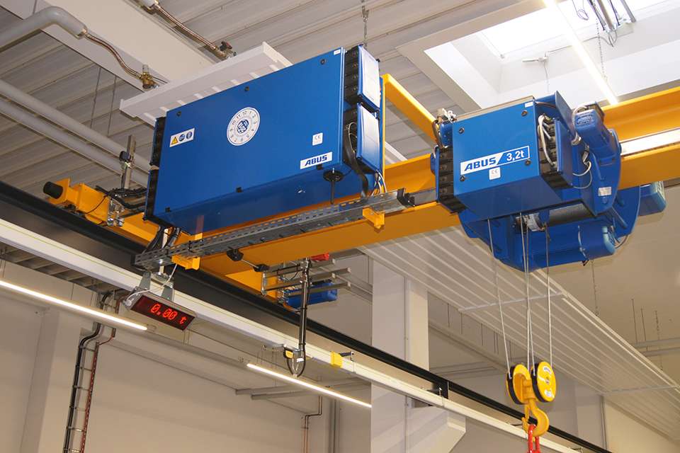 大廳的另一部分位于可接近的鋼平臺下方,用于較小的測試裝置。由于單梁橋式起重機無法覆蓋該區(qū)域,因此這里使用了一個懸掛系統(tǒng)。懸掛式軌道系統(tǒng)基于模塊化系統(tǒng)設計,可以適應幾乎所有空間要求,尤其是出于懸吊和固定起重機軌道的不同選擇。在此安裝的EHB-X輕型單梁懸掛系統(tǒng),其行車軌道的一側通過夾具固定在鋼架平臺的軋制截面梁上,另一側通過銷釘直接固定在鋼筋混凝土天花板上。極低的整體高度和上升式的起重機確保了可用房間高度的最佳利用。安裝的起重機系統(tǒng)額定載荷為160公斤,配有電動環(huán)鏈葫蘆。電動環(huán)鏈葫蘆也采用了變頻器控制,以確保能夠精確平穩(wěn)地移動非常敏感的負載:例如在本應用中,HMI屏幕就是典例。此外,用于上下提升位置的機械過載保護和電子葫蘆提升限位開關,可防止由操作失誤導致的潛在危險或損壞。