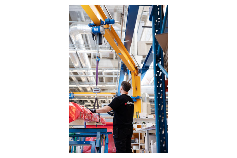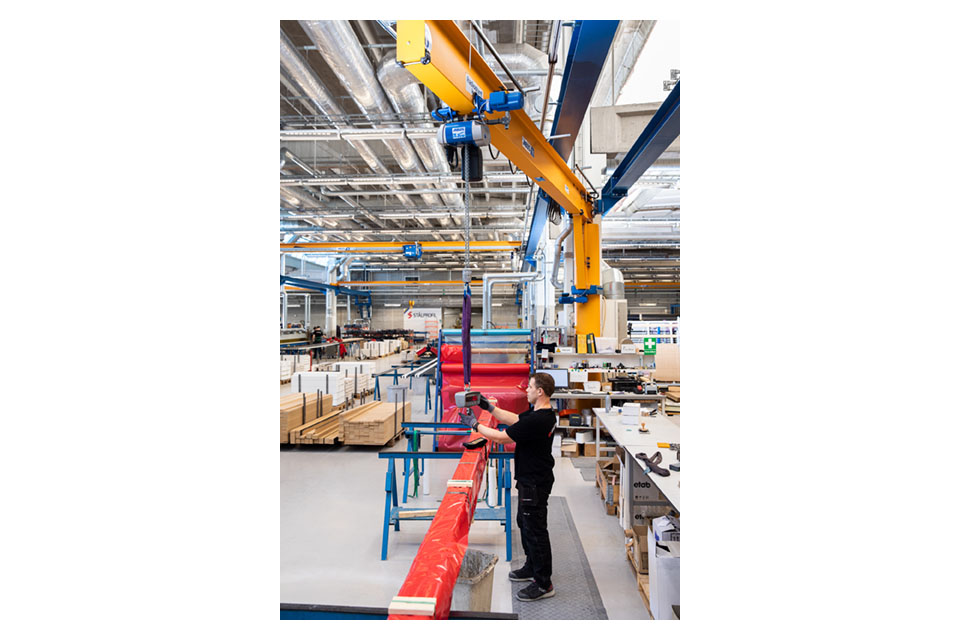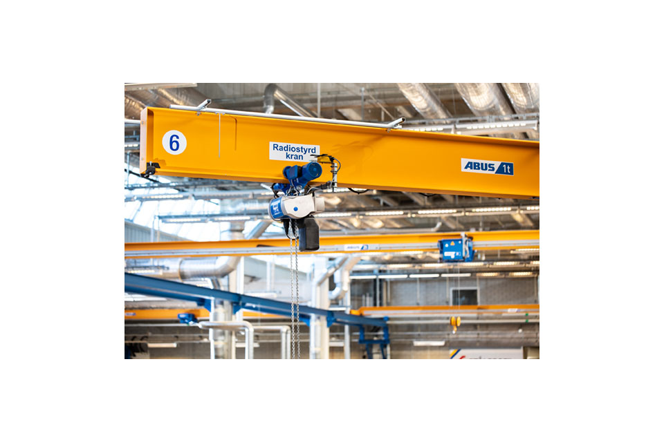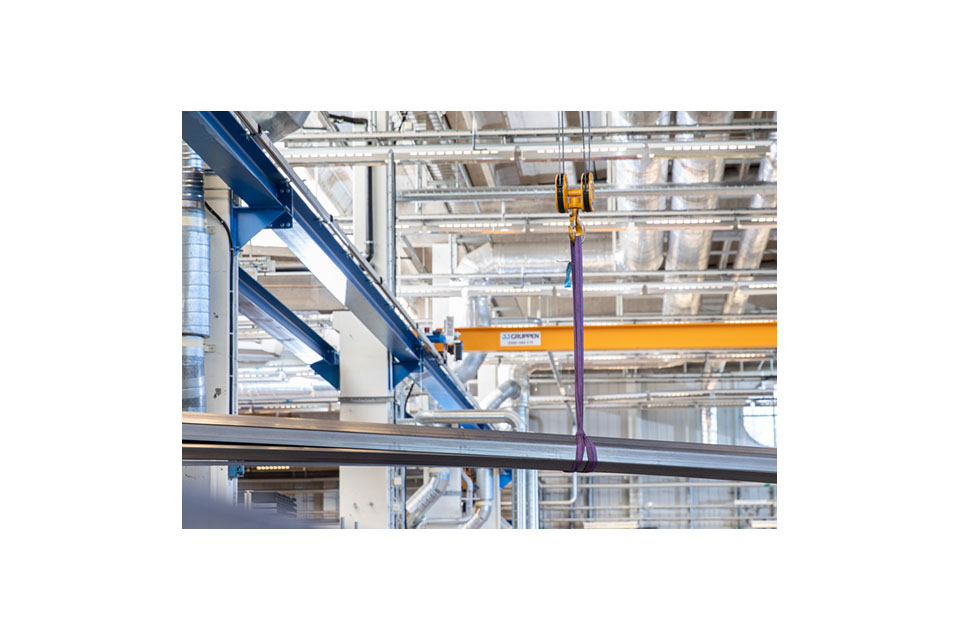 四條起重機(jī)軌道的建設(shè)需要60噸鋼材,且必須安裝在極為狹窄的空間內(nèi)。五臺(tái)ELV型單梁橋式起重機(jī)已分別運(yùn)行于長(zhǎng)72米或48米的起重機(jī)軌道上。ELV型起重機(jī)的額定載荷為2噸、跨度在15米至17米之間。所有起重機(jī)均配有變頻器和ABURemote無(wú)線遙控器。負(fù)載掛在吊鉤上,無(wú)線遙控器上的顯示屏向操作者顯示出負(fù)載數(shù)值。除了負(fù)責(zé)整個(gè)廠房?jī)?nèi)物料搬運(yùn)的橋式起重機(jī)外,廠房還安裝了一臺(tái)和工作區(qū)域相關(guān)的工位起重機(jī):一臺(tái)起重量為1噸、臂長(zhǎng)7米的VS型立柱式旋臂起重機(jī)。該旋臂起重機(jī)也是由無(wú)線遙控器控制。