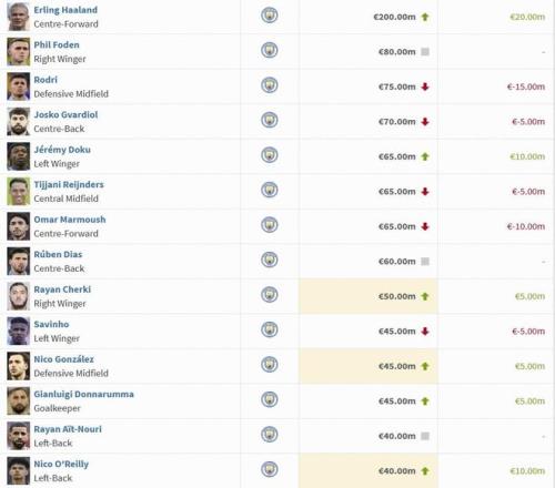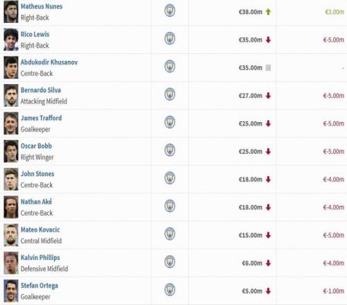 曼城球員身價(jià)變動(dòng)(單位:歐元)