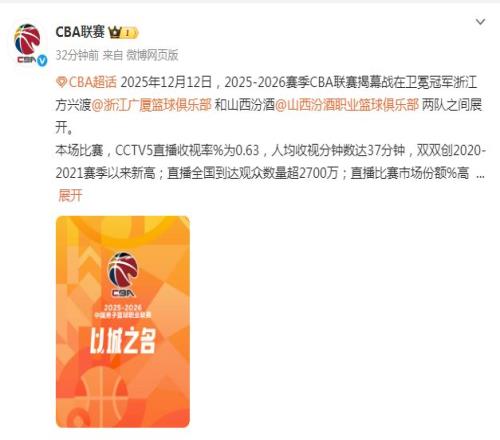北京時(shí)間12月13日,CBA官方公布2025-26賽季揭幕戰(zhàn)的收視情況,央視直播收視率創(chuàng)20-21賽季后近5年新高,全國觀眾人數(shù)超2700萬,市場份額創(chuàng)近18年新高,而抖音直播總直播觀看人次5001萬。