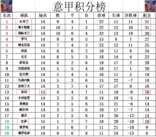 積分榜方面,意甲是目前五大聯(lián)賽榜首最激烈的,前三的AC米蘭,那不勒斯和國米分差就在1分之間,本輪三強(qiáng)將繼續(xù)展開榜首的爭奪。萊切最后階段破門擊敗比薩贏得保級大戰(zhàn)后,將和比薩的差距拉大到6分,暫時遠(yuǎn)離了降級區(qū)。