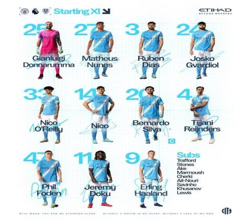 曼城首發(fā):25-多納魯馬、27-馬特烏斯-努內(nèi)斯、3-魯本-迪亞斯、24-格瓦迪奧爾、33-尼科-奧賴?yán)?4-尼科-岡薩雷斯、20-伯納多-席爾瓦、4-賴因德斯、47-福登、11-多庫(kù)、9-哈蘭德